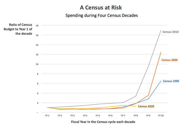 Many census experts are worried that the run-up preparation for Census 2020 is being seriously underfunded. The Census Project, an advocacy coalition of which APA is part, has charted the 10-year funding cycle for past decennial censuses. In each of the past four decades, there was a marked increase in years seven and eight to fund a comprehensive field test and develop new techniques. That isn't happening this time around.