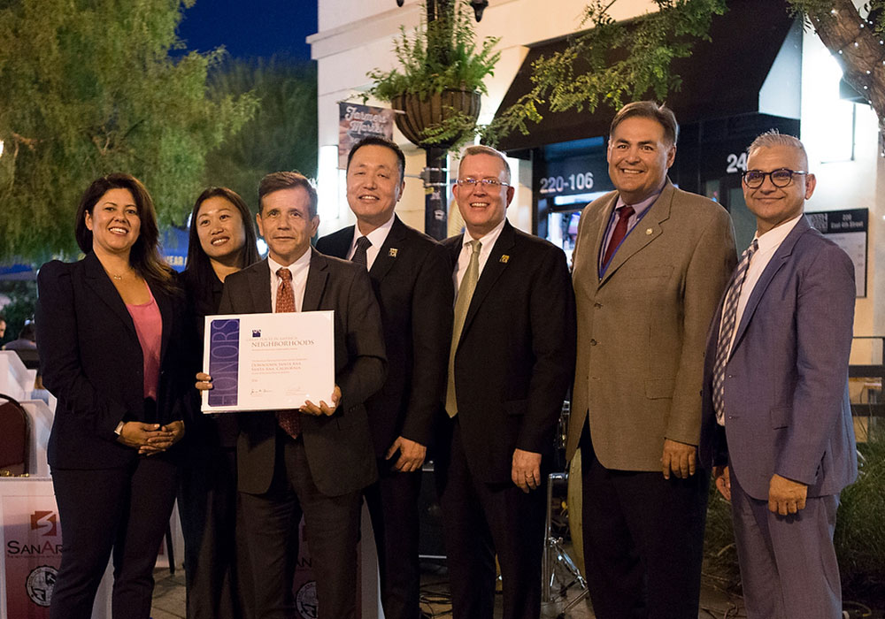 Downtown Santa Ana and APA California Chapter leadership are holding up Downtown Santa Ana's Great Neighborhoods certificate. Photo by Brian Feinzimer.