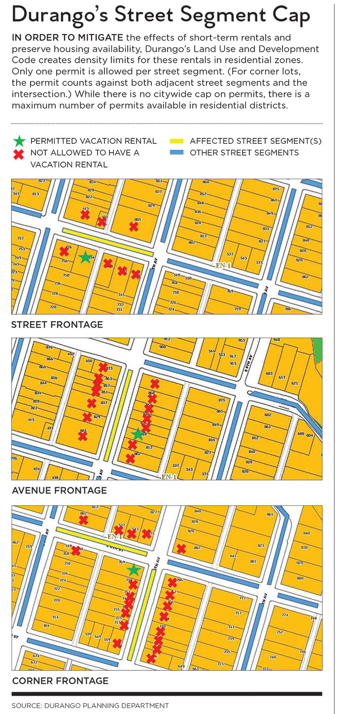 In order to mitigate the effects of short-term rentals and preserve housing availability, Durango's Land Use and Development Code creates density limits for these rentals in residential zones. Only one permit is allowed per street segment. (For corner lots, the permit counts against both adjacent street segments and the intersection.) While there is no citywide cap on permits, there is a maximum number of permits available in residential districts.