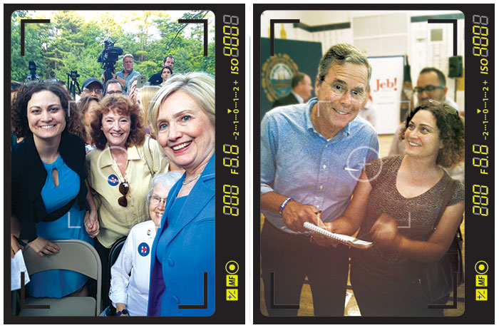 Elizabeth Wood (left) with Hillary Clinton and Kathleen DiFruscia, an alternate planning board member in Windham, New Hampshire. Right: The author with Jeb Bush, who told her that his gubernitorial tenure made him familiar with planning. Photos Courtesy Elizabeth Wood.