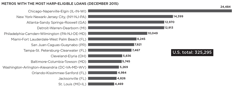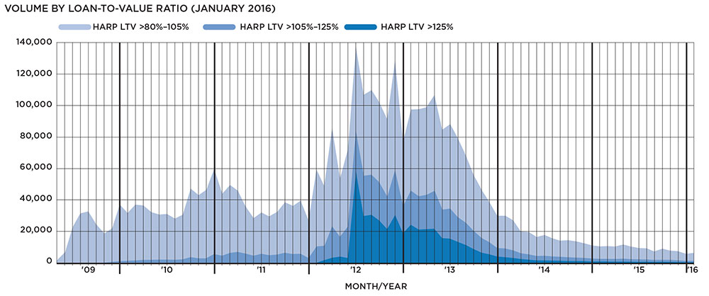 HARP loans increased sharply in June 2012, the year when the program was expanded to allow deeply underwater borrowers — those with loan-to-value ratios exceeding 125 percent — to refinance. Still, the programs have served far fewer home owners than intended (see bottom graph). Some 325,000 U.S. borrowers are still eligible.
