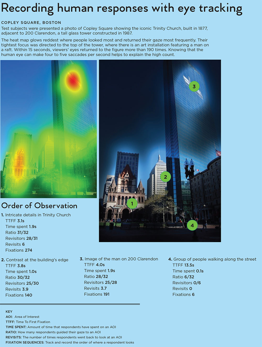 Take, for example, the photo of Copley Square in downtown Boston showing the iconic Trinity Church, built in 1877, adjacent to the infamous glass skyscraper built in 1987 and formerly called Hancock Tower, but now known as 200 Clarendon. The heat map glows reddest where people looked most and returned their gaze most frequently. Their tightest focus was on an art installation of a man on a raft affixed between the 44th and 50th floors of the glass tower. Within 15 seconds, viewers went back to check him out more than 190 times. Knowing that the human eye can make four to five movements (called saccades) per second helps to explain the high count.