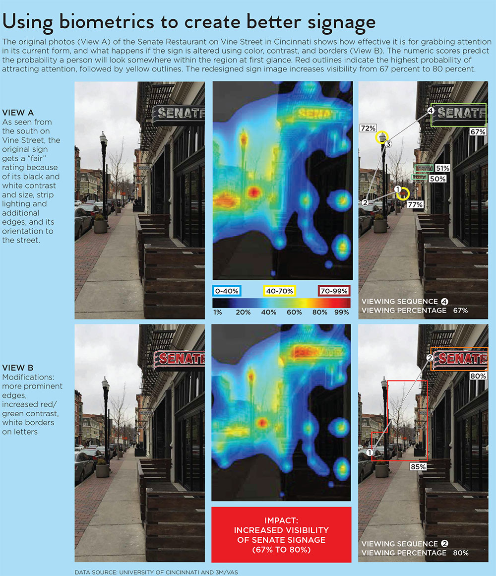 For example, a triptych shows the scene outside the Senate, a restaurant in downtown Cincinnati. A student team took the photograph, then uploaded it to the emulation software to see how it is viewed. Students then edited the original image in Adobe Photoshop to improve the sign's "attention-getting" power. The software predicted that their redesign, substituting red for white neon lettering, increased the sign's allure from 67 to 80 percent.