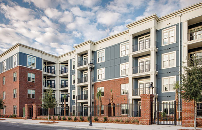 At dusk, men in business casual and women in little black dresses are sipping wine and chatting over the beat of a cover band that transforms raucous rock anthems into tasteful ballads. It's the grand opening of The Standard, a 280-unit, four-story luxury apartment complex on James Island across the Ashley River from Charleston, South Carolina.The Standard boasts a yoga studio, an outdoor saltwater pool, and an open-air courtyard for parties like this one on a mild evening in November.