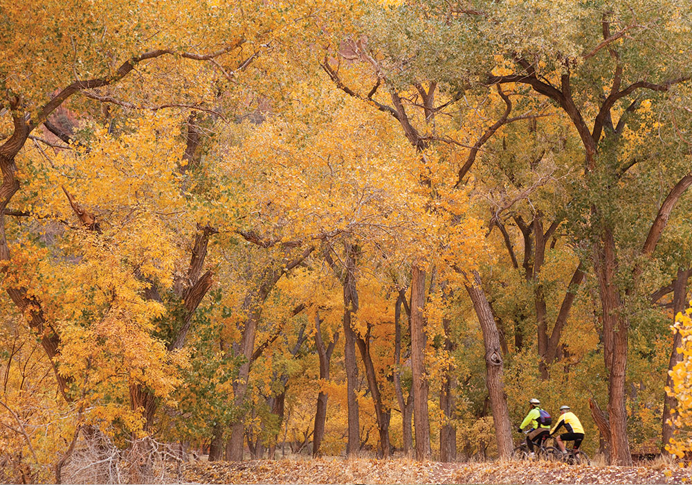 Two cyclists take an autumn ride through a cottonwood forest in Utah's Zion National Park. Purestock/Alamy Stock Photo.
