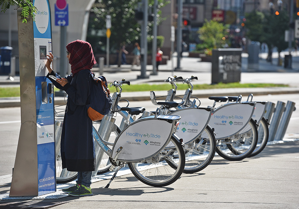 Healthy Ride, Pittsburgh's nonprofit bike-share program, offers three pricing tiers: pay as you go and two different monthly memberships. According to research by the National Association of City Transportation Officials, offering short-term payment options promotes bike-share accessibility, especially for low-income users. Here, a woman checks in at a Healthy Ride station in downtown Pittsburgh. Photo by Bob Donaldson, courtesy Post-Gazette.