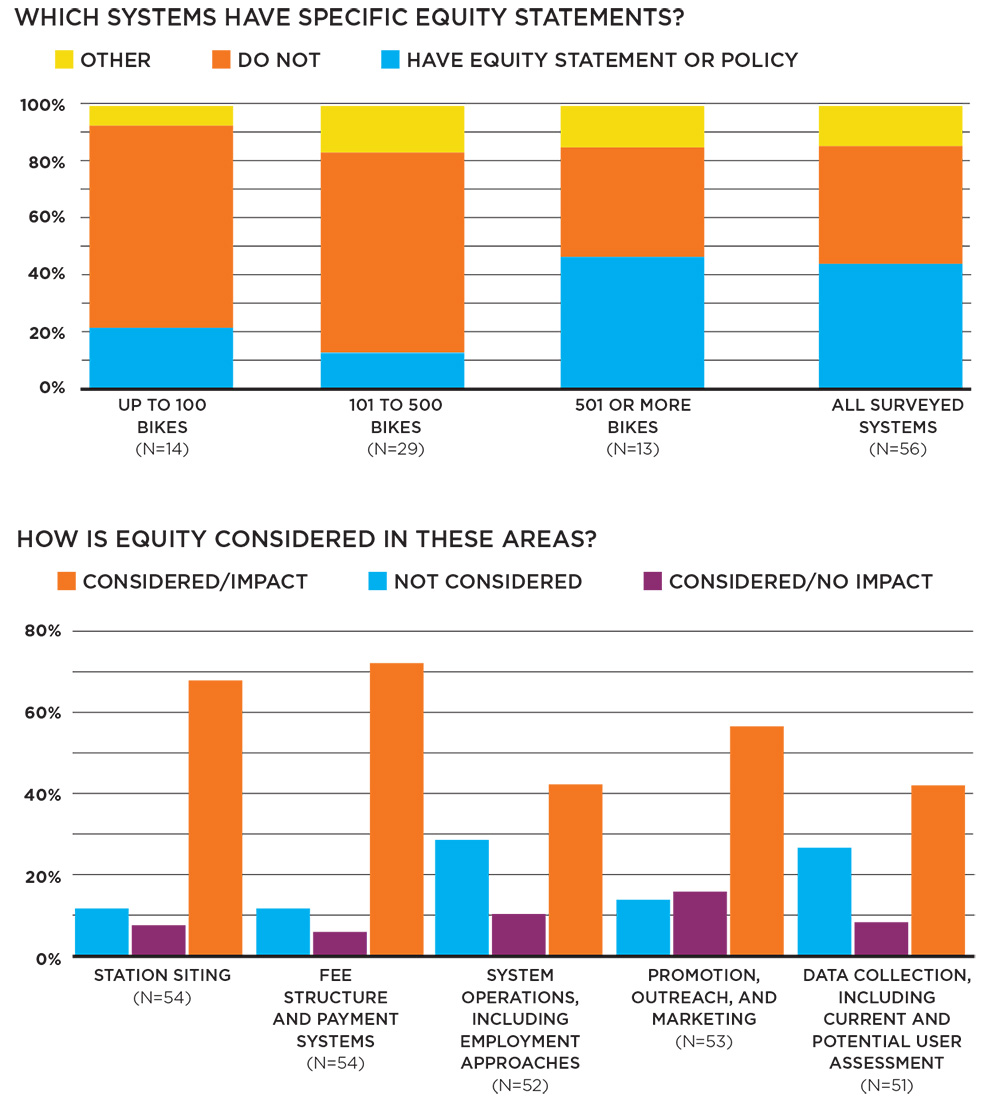 In 2016, researchers affiliated with the Transportation Research and Education Center at Portland State University surveyed bike-share operators to find out whether (and how) equity is considered when making decisions about their systems. (Percentages below that do not total 100 percent are due to "Don't Know/NA" responses.)