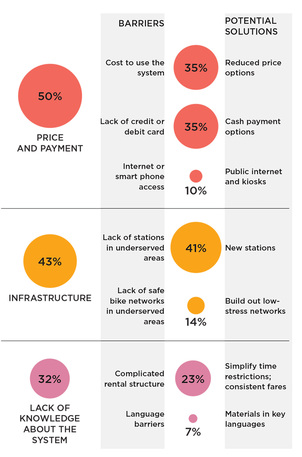 Over 80 percent of responding systems shared what they think are the key obstacles to bike-share participation for underserved communities in their cities, and TREC suggested remedies. Here is a selection.