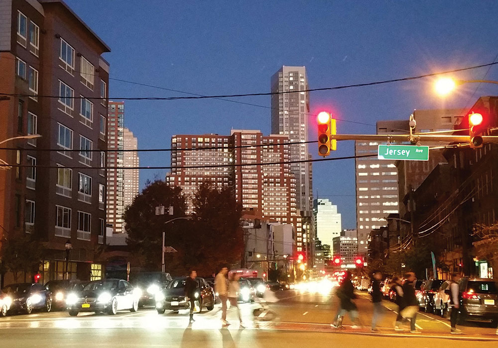 Jersey City's main downtown street, Christopher Columbus Drive, at Jersey Avenue. Photo by Colleen O'Dea.