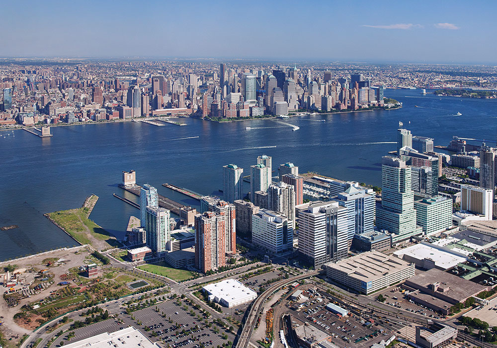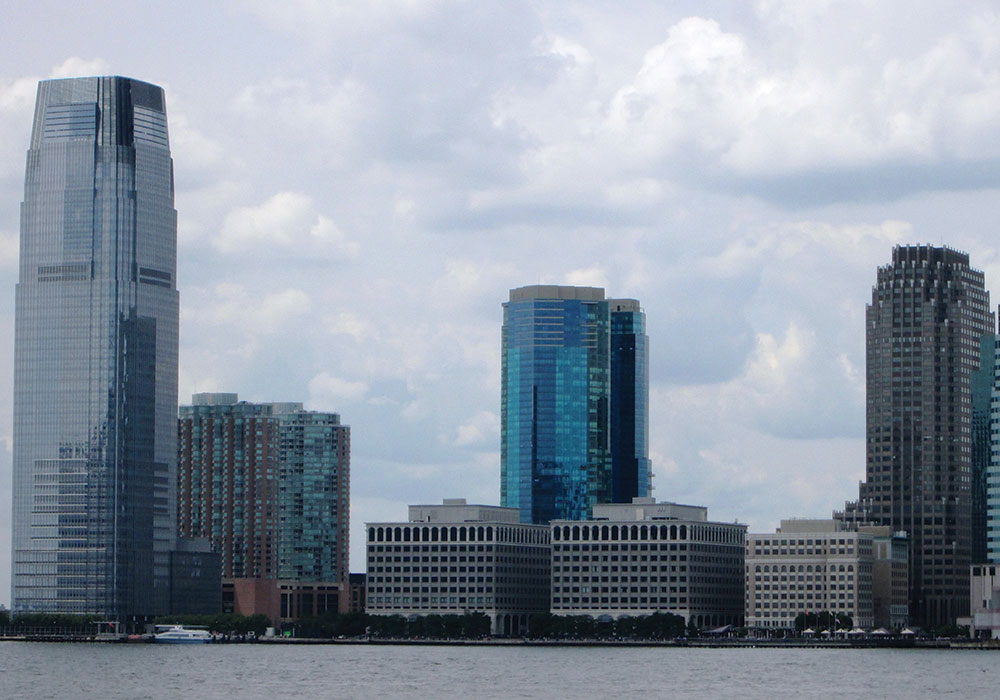 The skyline of Jersey City, taken from Rockefeller Park in Battery Park City in Manhattan in 2013.At the far left is 30 Hudson Street (Goldman Sachs Tower), Jersey City's tallest building. Photo by MaryAnn Bucci-Carter.