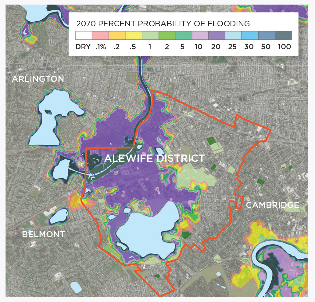Although Alewife is the farthest Cambridge neighborhood from the coast, the recent Cambridge Climate Change and Vulnerability Assessment showed that expected sea-level rise over the next several decades will cause storm surges to flow up the Mystic River and Alewife Brook, flooding the area. By 2070 much of Alewife will have a 20 percent chance of flooding each year. A one-percent-chance storm in 2070 is likely to result in three-foot-deep flood waters.