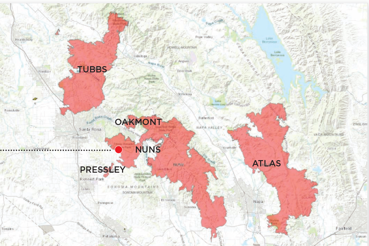 Fire snapshot, October 17, 2017: The California Department of Forestry and Fire Protection mapped several fires that burned simultaneously in Northern California when Parkinson's neighborhood was hit. The wildfires were fueled by years of drought, tinder-dry vegetation, and gusty winds. Map courtesy Pete Parkinson.