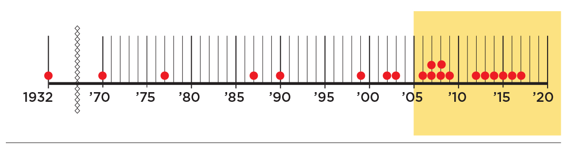 California is one of the states hit the hardest by recent wildfires. The December 2017 and January 2018 Thomas fire in Ventura and Santa Barbara counties was the largest in modern California history, burning over 280,000 acres, claiming over 1,000 structures, and taking two lives. Out of the state's 20 largest wildfires on record from 1932 to present, 14 of the blazes occurred after the year 2000, and six of those have burned since 2012.