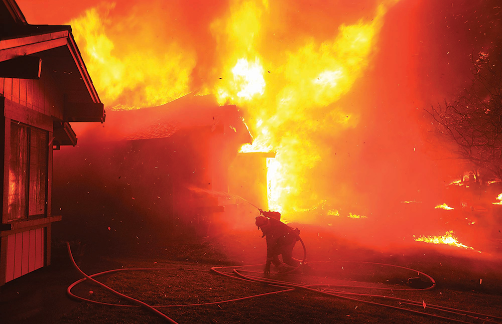 A firefighter battles flames in Coffey Park during the Tubbs Fire, which destroyed more than 5,000 structures in Santa Rosa, California, last October. Photo by Kent Porter/The Press Democrat, via Associated Press.