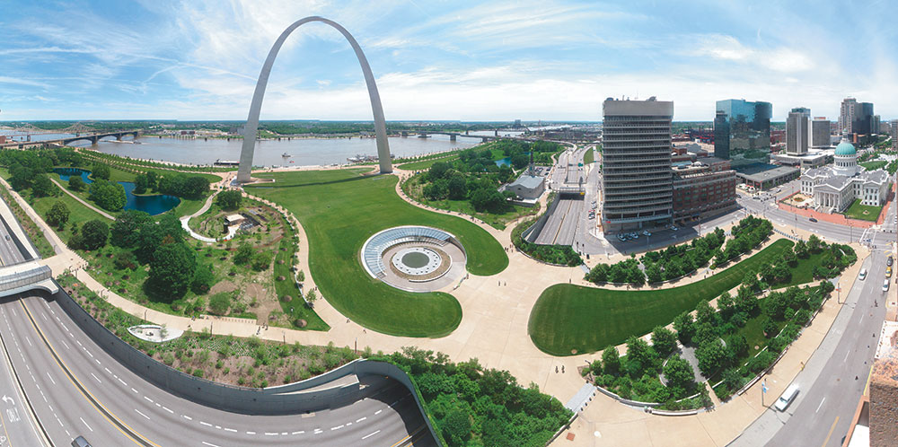 A grassy land bridge over I-44 now links the renovated Gateway Arch National Park with downtown St. Louis. It opened this summer. Photo courtesy Gateway Arch Park Foundation.