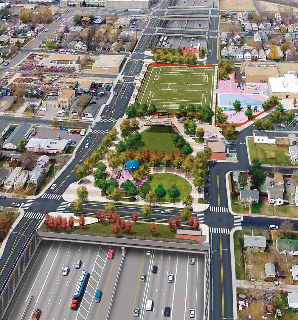 The plan for the deck park over I-70 in Denver took years of planning and compromise with the Elyria-Swansea neighborhoods, and ended up preserving an elementary school and adding a playground extension. Image courtesy Colorado Department of Transportation.